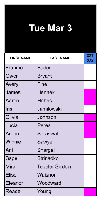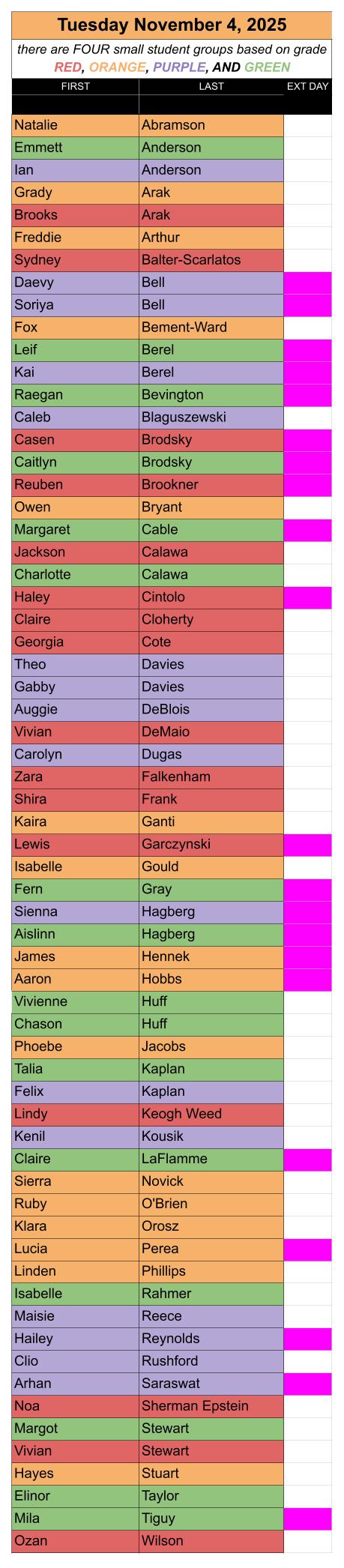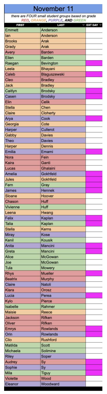 Click on the student list below to view larger. PINK boxes indicate if you included EXTENDED DAY with your initial registration.